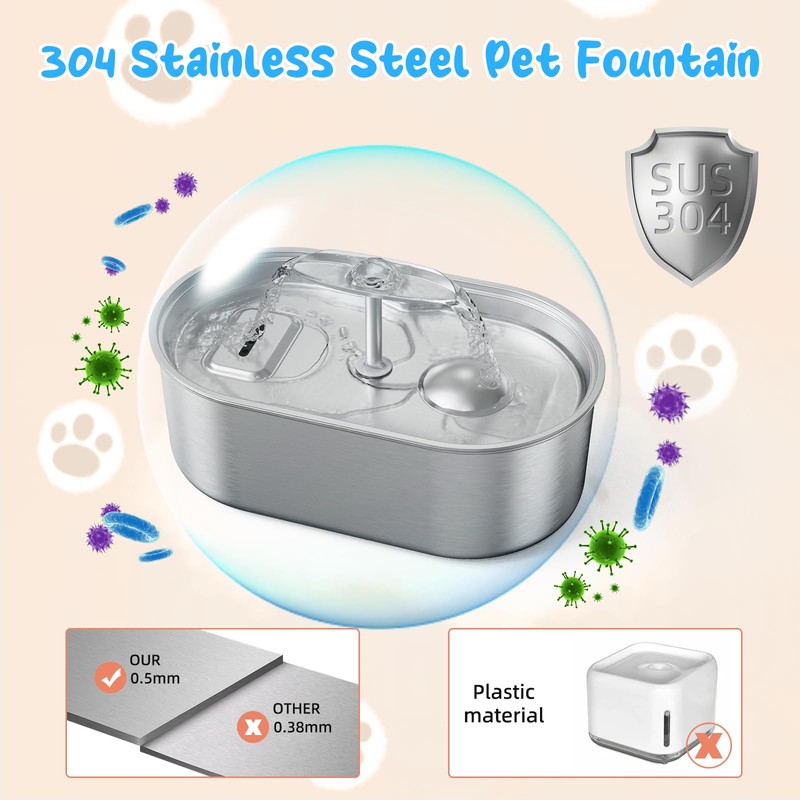 - đđșăSafe MaterialăAll parts of the VALUCKY cat water dispenser are made of 304 food-grade stainless steel.We use thicker stainless steel material,the thickness is 0.5mm (other 0.35mm),sturdy and durable. Compared with plastic material, stainless steel is easy to clean,corrosion and high temperature resistant,dishwasher safe.Metal cat fountain has longer service life.