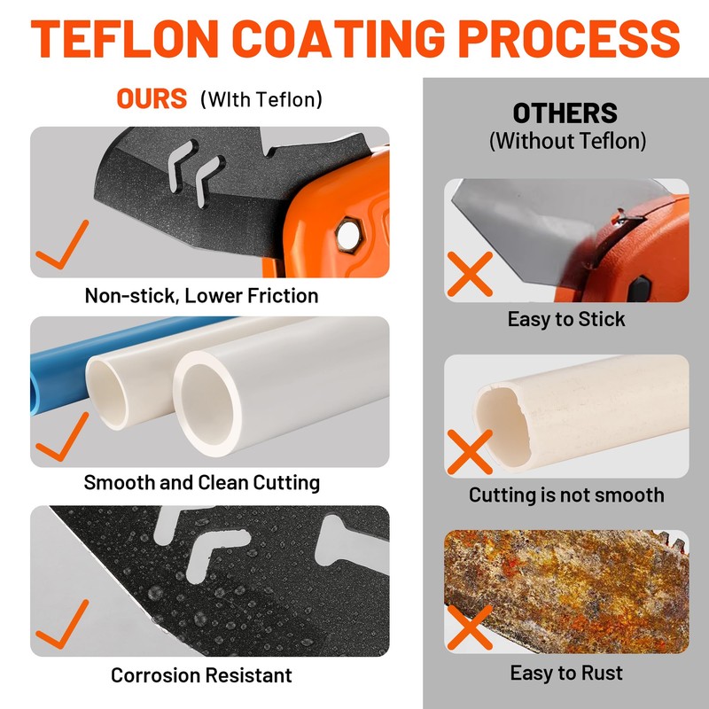 • Sharp Blade: The PVC Pipe Cutter is made of SK5 steel. Both two cutters are coated with Teflon, so they cuts smoothly with no frays or uneven angles, which provides you with a smooth and accurate cutting experience every time