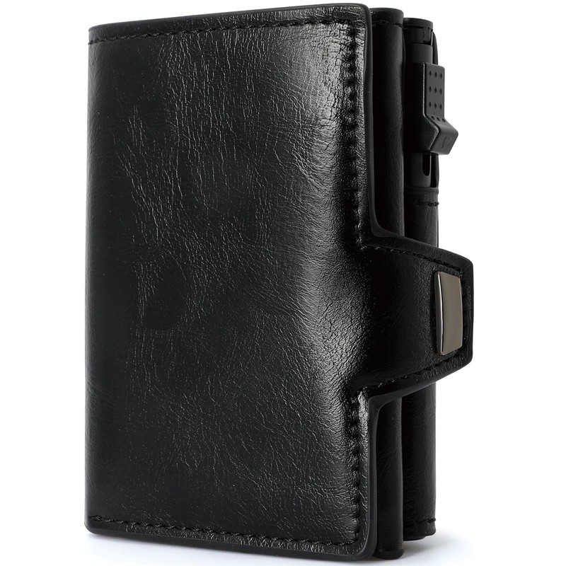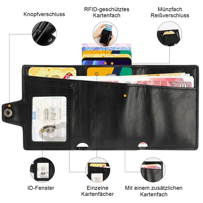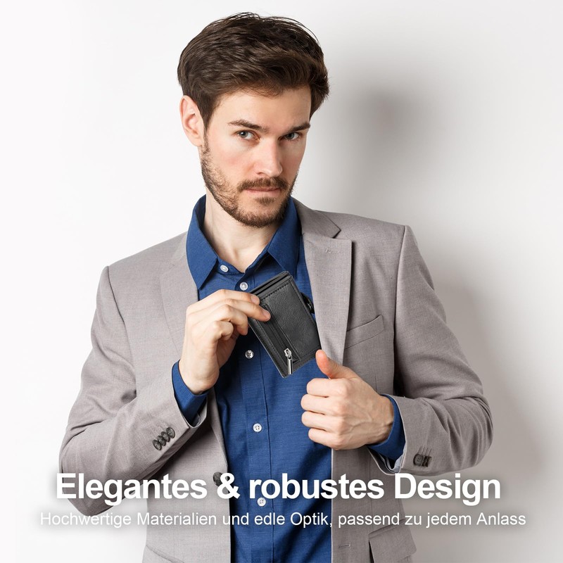 - Compact & Elegant Design: This men's leather wallet (10 × 7 × 3 cm) can hold banknotes, a banknote compartment and up to 8 cards. The pop-up card holder holds 5 cards, plus 2 card slots and 1 ID window. A coin compartment on the back makes this men's mini wallet perfect for everyday use.