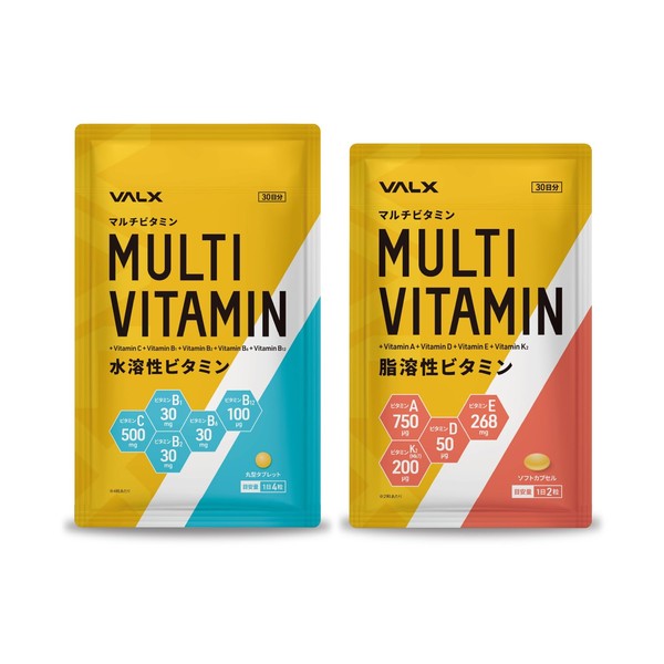 - ✅「VALX マルチビタミン 水溶性ビタミン」は、タイムリリース処方だから体内でゆっくりと溶け出すので、代謝の速い水溶性ビタミンでも成分が長い時間とどまります✅「VALX マルチビタミン 脂溶性ビタミン」は、飲みやすいソフトカプセルタイプでより効率よく吸収できるようにオイルタイプの原料を厳選