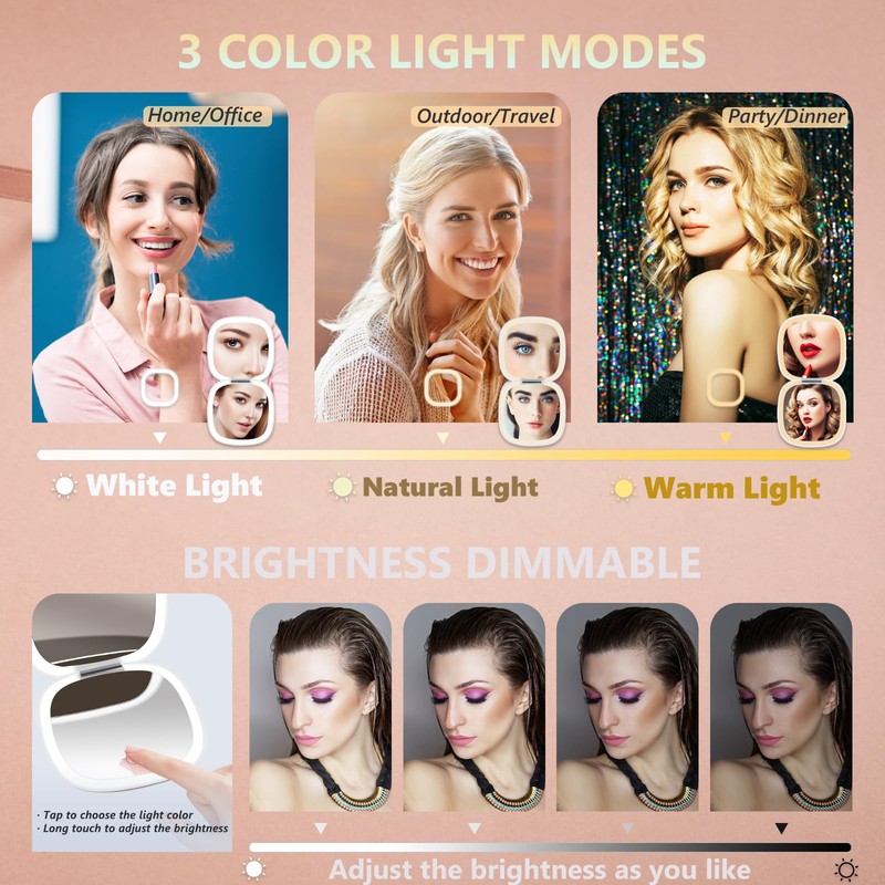 - 【3 luces de color y brillo ajustable】Nuestro espejo de maquillaje de viaje VAMILLKRA te proporciona 3 tipos de colores de luces (luz blanca/luz natural/luz cálida) para diferentes aplicaciones de maquillaje. Presiona brevemente el botón táctil para cambiar el modo de luz, mientras presionas durante mucho tiempo para atenuar o iluminar el brillo de la luz como quieras. Nuestras luces LED con ambos lados son bastante brillantes para iluminar tu cara.