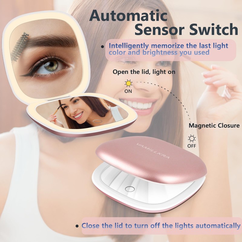 Vamillkra - Espejo de viaje con luz, espejo de aumento 1X/7X, espejo de maquillaje compacto con iluminación LED de 4 pulgadas, espejo de maquillaje compacto, con luz regulable de 3 colores, espejo de