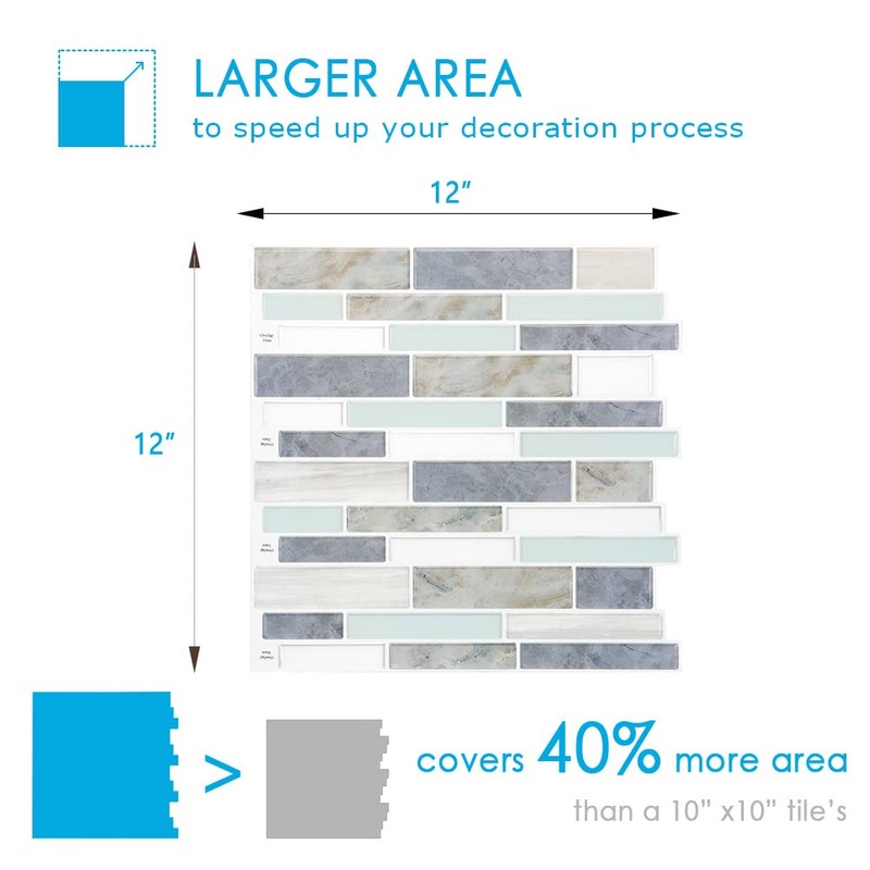 - ►LARGER COVERAGE AREA: 10 sheets self-adhesive tiles, 11.8" X 10.8" each, which covers more area than normal 10"x10" tile.It better adapts to the size of ordinary walls.Realistic tile effect with 3D texture.