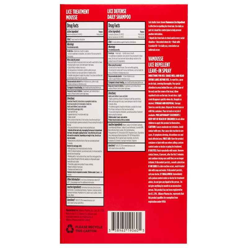 The Vamousse Pro Lice Emergency Head Lice Treatment Kit is an all-inclusive kit that includes products designed to address every head lice situation. This kit includes the clinically proven Vamousse Lice Treatment Mousse, which kills lice, super lice, and eggs in just 15 minutes. It also comes with Vamousse Lice Defense Daily Shampoo, the only daily routine shampoo that can prevent lice and super lice before detection, and Vamousse Leave-In Lice Spray, a proactive step against lice for daily use before an outbreak occurs.