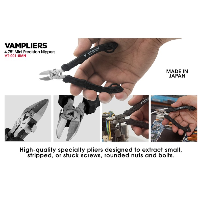 - VT-001-5MN: Heat-treated carbon steel mini nippers that easily and cleanly cut through fine wire, electronic & PCB components, wire ties, zip ties, UTP ethernet cables, lead wires, and copper wires