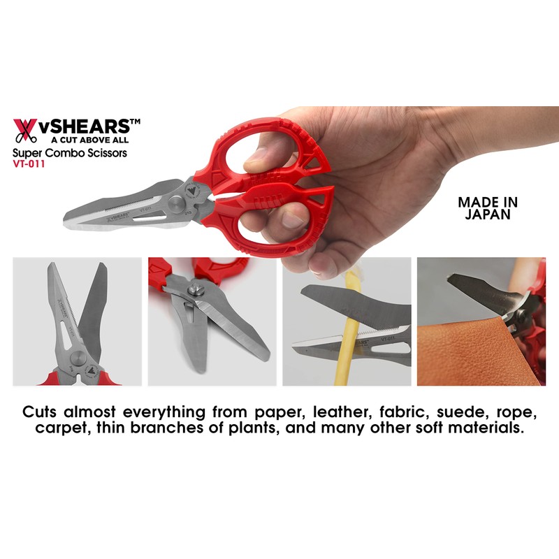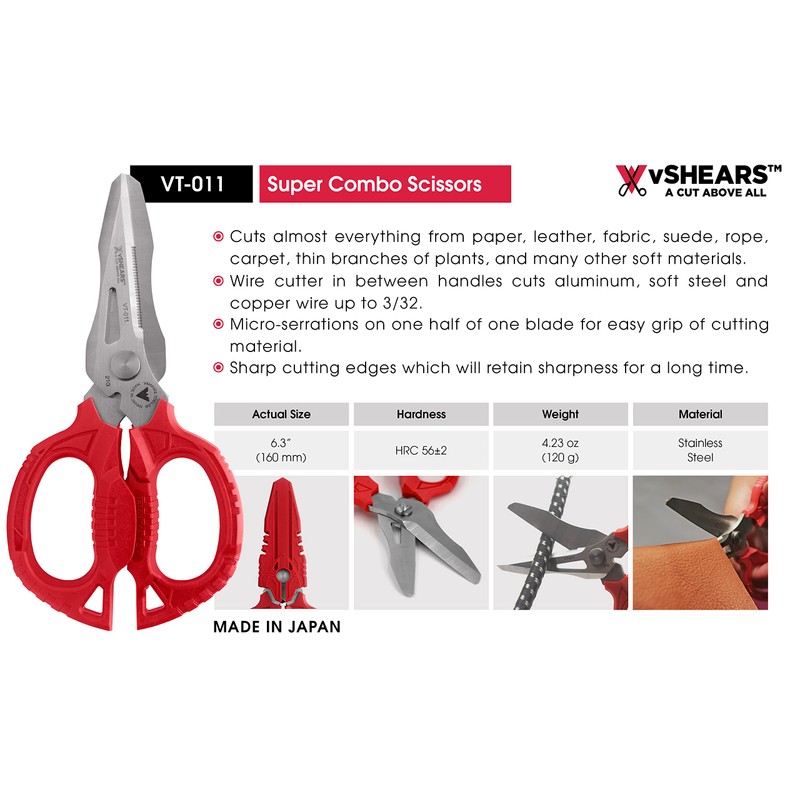 - VT-011: 4-in-1 Super combo scissors with built-in wire cutter and box opener, able to cut wire, leather, paper, fabric, rope, CD, thin films, cabtire cord, and branches with its micro-serrated blade