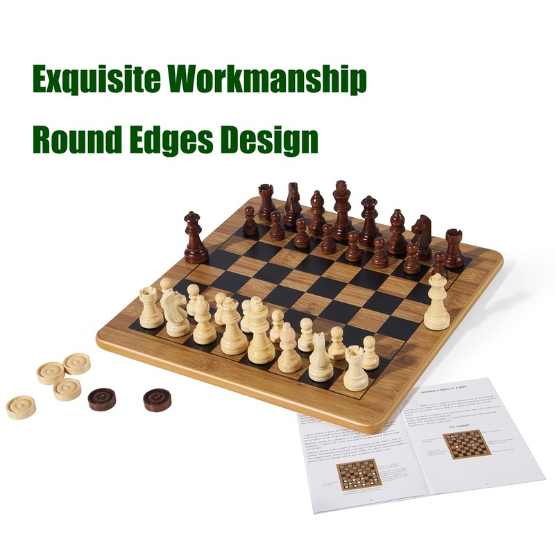 - 【EXQUISITE PLAYING PIECES】The chess pieces are with felt bottoms preventing scratches, also included 2 extra queens for pawn promotion and the checker pieces are stackable that easy to make a king, detailed design ensures no pieces slipping during gameplay, offering long time use and tons of fun for both kids and adults
