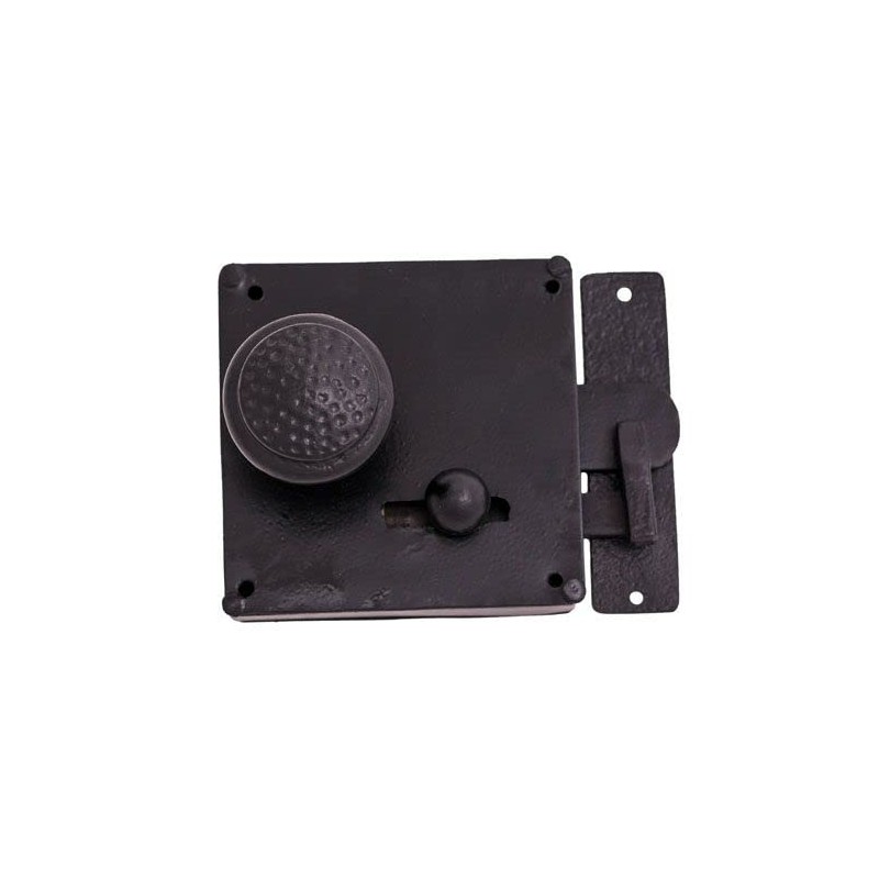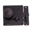 • This rustic door latch is made of iron for rugged dependability. The set includes two round pebbled knobs.