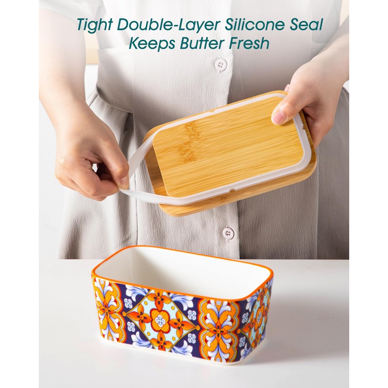 - 【Natural Bamboo Lid & Butter Knife】The eco-friendly bamboo lid is designed for both form and function—it features a smart groove to hold the included butter knife, keeping your kitchen organized. When it's time to cut or spread, the lid doubles as a convenient cutting board. Enhanced with a double-layer silicone ring, it offers excellent sealing performance to help keep your butter fresh for longer.