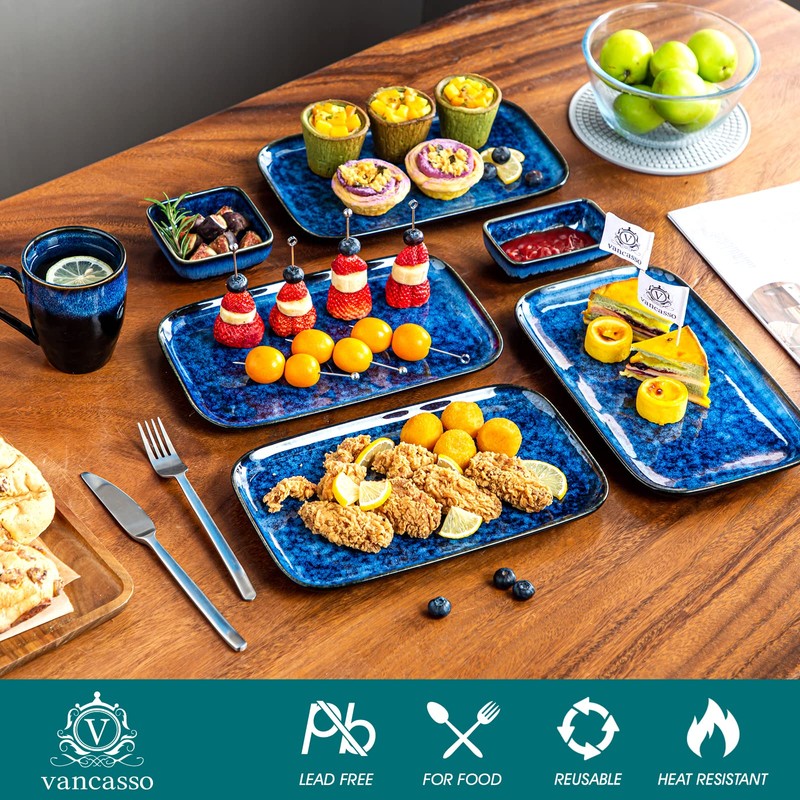 vancasso Stern Serving Platters Set of 4, 11 Inches Rectangular Ceramic Serving Plates, Blue Serving Trays for Entertaining