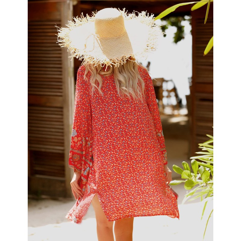 Vancavoo Beach Tunic Women's Beach Dress Long Summer Pareo Beach Tunic Floral Print Cardigan Boho Bikini Cover Up Long Sleeves Beach Poncho Beach Cardigan Swimwear, red
