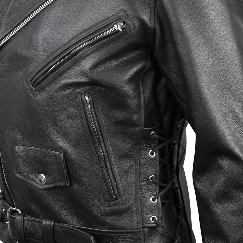 Vance Leather Mens Premium Cowhide Conceal Carry Insulated Liner and Side Laces Classic MC Motorcycle Biker Black Leather Jacket (Black, 5X-Large)