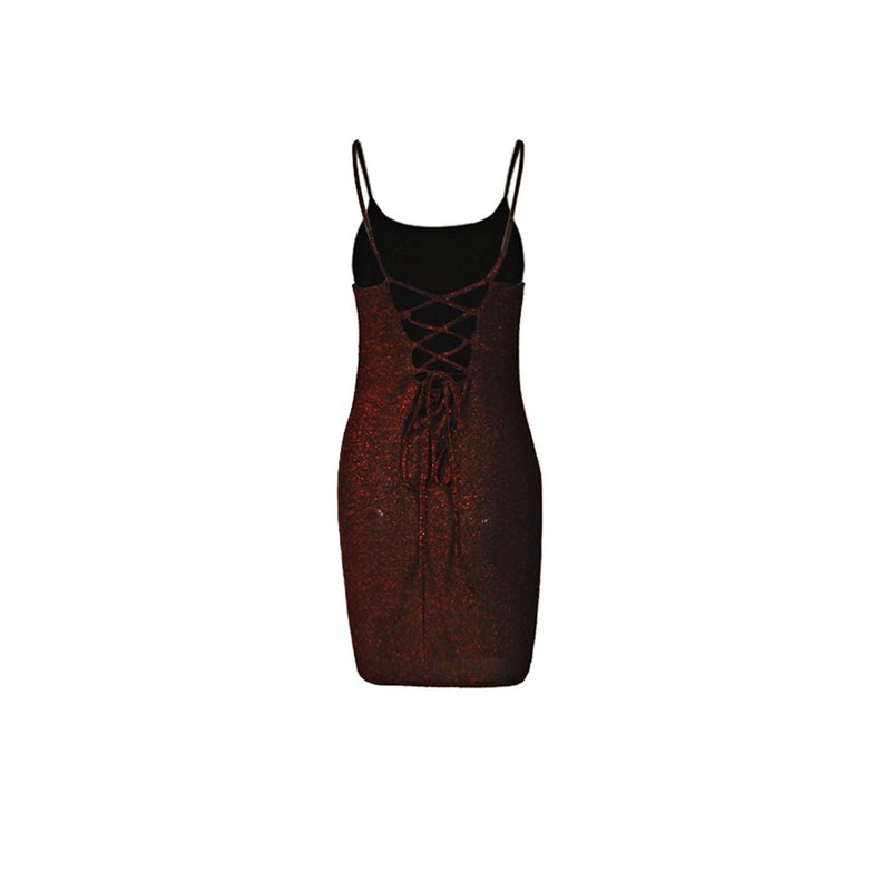 - Features: Sparkly, Glitter, Straight Neckline, Sleeveless, Backless, Open Back, Spaghetti Strap ,Lace Up Tie, Cutout Back Criss Cross Bandage, Cute Mini Dress, Solid Color, Slim Fit Above Knee Dress.