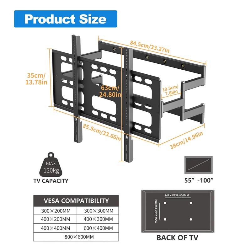 Vanconwey TV Wall Mount for 55-100 Inch TVs,up to 264 lbs,TV Mount with Extension,Wall Mount TVs Bracket Full Motion with Articulating Dual Arms,Max VESA 800 x 600mm (VC-Z1688)