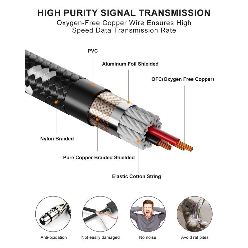- 【Double Shielding to Prevent Interference】XLR cables uses 100% 24AWG oxygen-free copper conductors, 100% pure copper braided, double shielding (Foil shielding and Copper braided shielding), make the XLR Microphone Cable sound quality undisturbed by external signals. HI-FI sound, no noise/hum or hiss, superb noise protection. Microphone cable 1 feet offers an exceptional clear sound for your instruments.