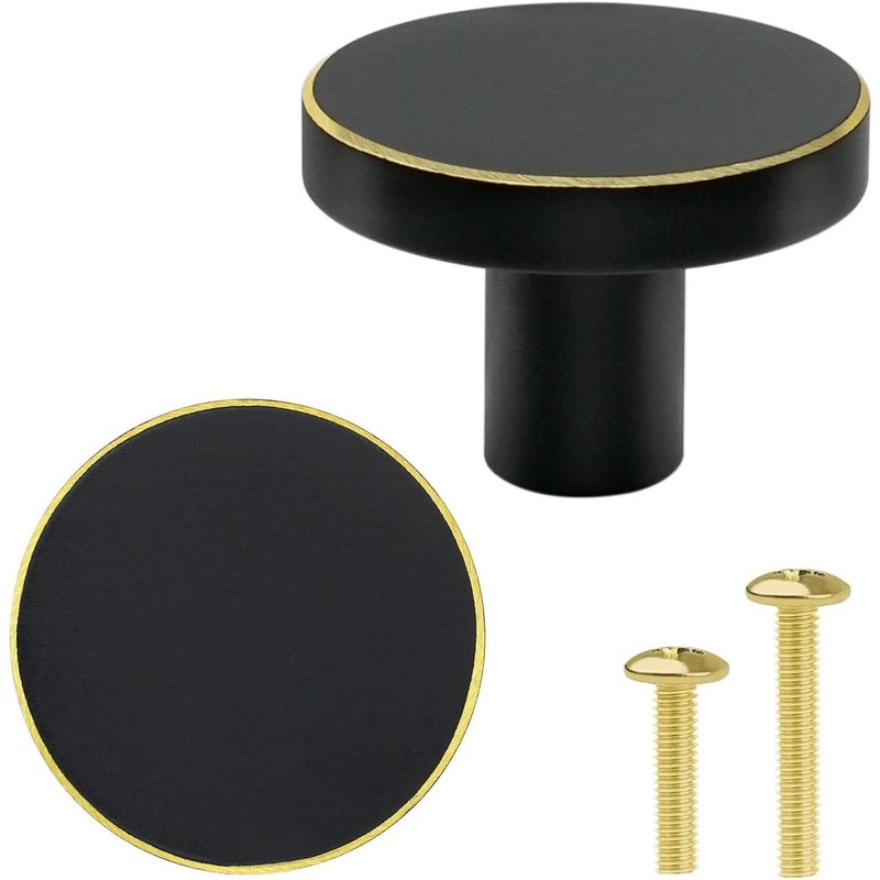 - Black knobs with gold edge look elegant and stylish, and they complement almost all popular cabinet finishes such as white, black, brown, green, gray, blue, oak, walnut, etc.