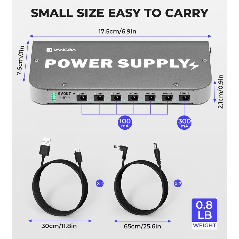 - [7 DC Outputs & Complete Accessories - Ready to Go] The rechargeable 9V guitar pedal power supply is designed to power a wide range of guitar pedals. It features 1 DC 9V/300mA output and 6 DC 9V/100mA outputs, covering the power needs of most low-power pedals. The included full accessory kit ensures you have all the necessary cables for each output, making it a convenient, all-in-one solution for your pedalboard power needs