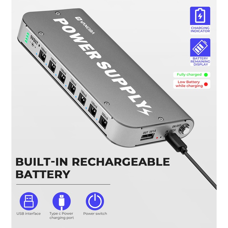 - [Ideal Pedal Power Solution for Guitarists on-the-go] Vangoa guitar pedal power supply features a built-in rechargeable battery, making it's ideal for guitarists on the go. It's perfect for situations where access to a power outlet is limited, such as live performances. The battery pedal power includes a power level indicator, ensuring you're aware of the remaining charge. With a high-capacity 4600mAh battery, it delivers up to 2 hours of uninterrupted performance on a full charge
