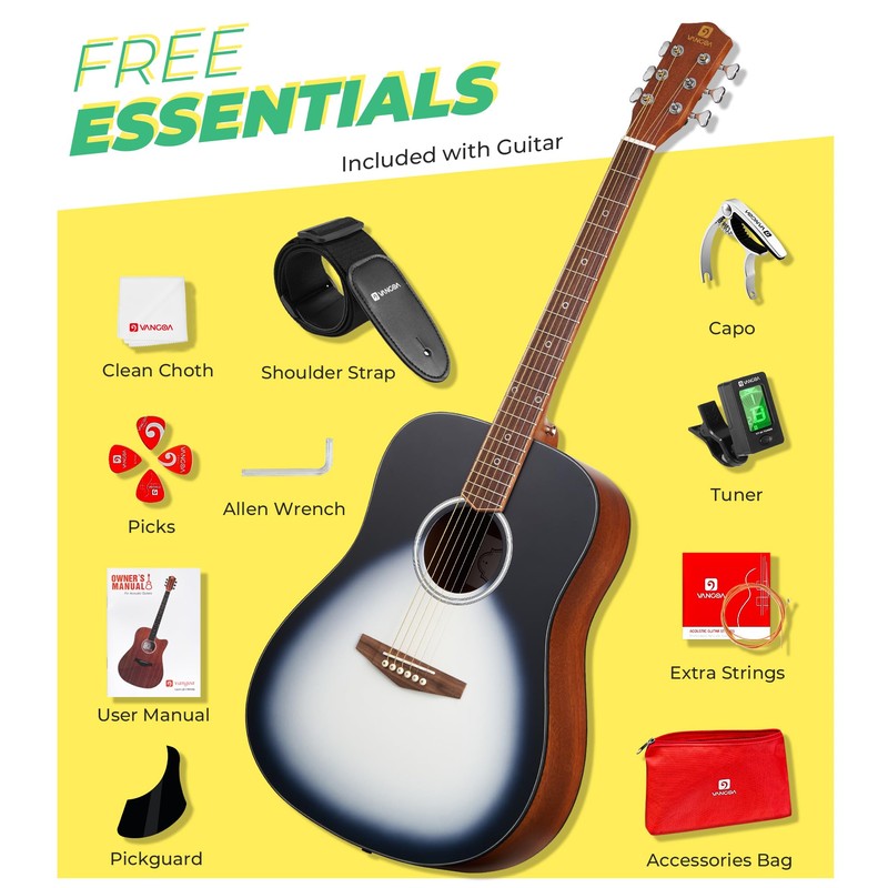- √[Upgraded Durable Starter Kit] Vangoa 41-inch beginner guitar bundle includes everything needed to start playing right away. With the premium quality beginner gutar kit, ensuring a perfect and long-lasting setup for beginners. It is a wonderful guitar package for beginners adults teens in Christmas, Birthday, celebrations.