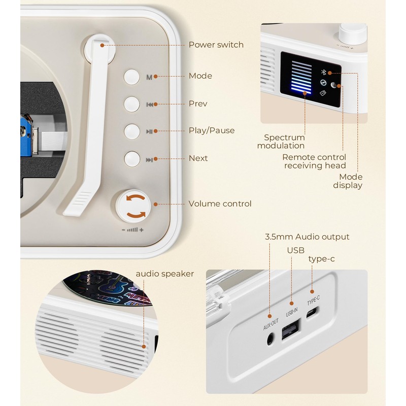 - All-in-One CD Player: Enjoy a comprehensive range of features including music player with built-in speakers, wireless 5.0 and USB inputs, remote control operation, wireless transmission(for wireless amplifier and headphones) , 3.5mm jack (for external speakers or headphones), catering to all your audio needs