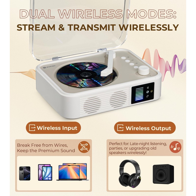 - Smart Wireless Dual Modes: Seamlessly stream music through high-quality CD player speakers as a BT Receiver. Switch to CD mode and transmit lossless audio to car systems or headphones with the CD-to-BT transmitter