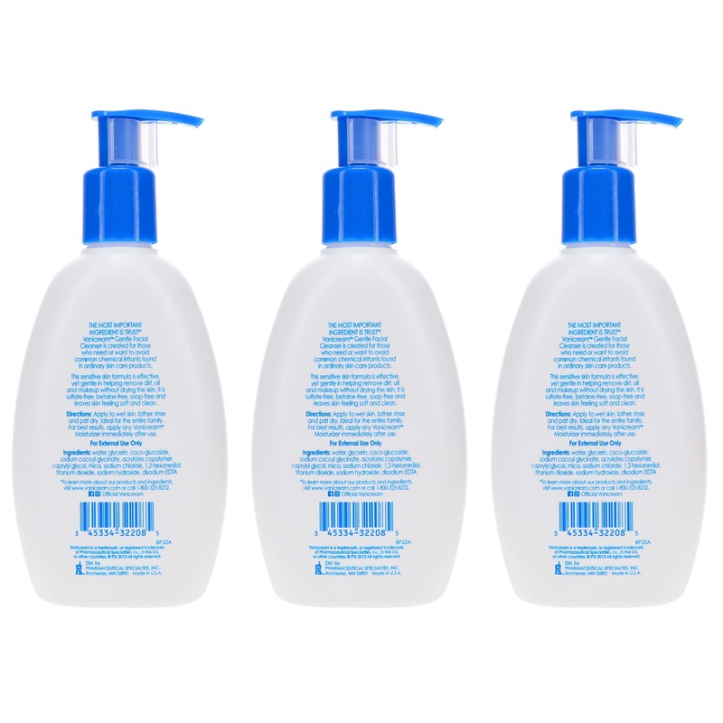 Vanicream Gentle Facial Cleanser for Sensitive Skin, 8 Oz (Pack of 3), Unscented, 24 Fl Oz