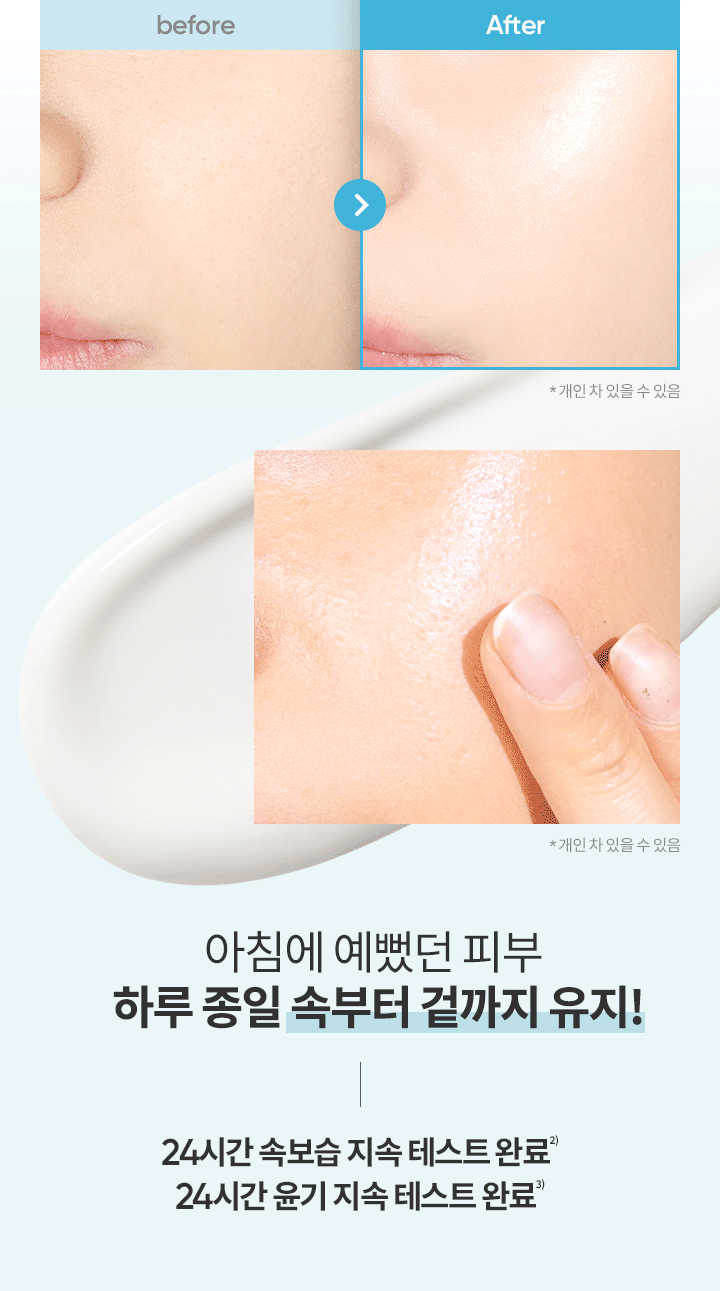 | 화장품법에 따라 기재/ 표시하여야 하는 모든 성분 | 정제수, 부틸옥틸살리실레이트, 트라이프로필렌글라이콜, 다이아이소프로필세바케이트, 에칠헥실트리아존, 테레프탈릴리덴디캠퍼설포닉애씨드, 폴리글리세릴-3다이스테아레이트, 나이아신아마이드, 프로필렌글라이콜다이벤조에이트, 2,3-부탄다이올, 트로메타민, 하이드로제네이티드폴리데센, 1,2-헥산다이올, 다이부틸아디페이트, 디에칠아미노하이드록시벤조일헥실벤조에이트, 폴리실리콘-15, 폴리카프릴릴실세스퀴옥세인, 소듐하이알루로네이트, 하이드로제네이티드레시틴, 펜틸렌글라이콜, C9-12알케인, 글리세릴스테아레이트, 비스-에칠헥실옥시페놀메톡시페닐트리아진, 세테아릴알코올, 글리세린, 브이피/에이코신코폴리머, 카보머, 암모늄아크릴로일다이메틸타우레이트/브이피코폴리머, 다이메티콘올, 글리세릴스테아레이트시트레이트, 이눌린라우릴카바메이트, 아크릴레이트/C10-30알킬아크릴레이트크로스폴리머, 에틸헥실글리세린, 소듐스테아로일글루타메이트, 아데노신, 알란토인, 판테놀, 사카라이드아이소머레이트, 스쿠알란, 엑토인, 토코페롤, 폴리우레탄-15, 세라마이드엔피, 다이프로필렌글라이콜, 부틸렌글라이콜, 소듐시트레이트, 시트릭애씨드, 카퍼트라이펩타이드-1, 세라마이드에이에스, 세라마이드에이피, 콜레스테롤, 세라마이드엔에스, 세라마이드엔지, 다이메틸실란올하이알루로네이트, 하이드롤라이즈드소듐하이알루로네이트, 하이드롤라이즈드하이알루로닉애씨드, 포타슘하이알루로네이트, 하이알루로닉애씨드, 소듐하이알루로네이트크로스폴리머, 하이드록시프로필트라이모늄하이알루로네이트, 소듐하이알루로네이트다이메틸실란올, 소듐아세틸레이티드하이알루로네이트, 세라마이드이오피, 향료 |