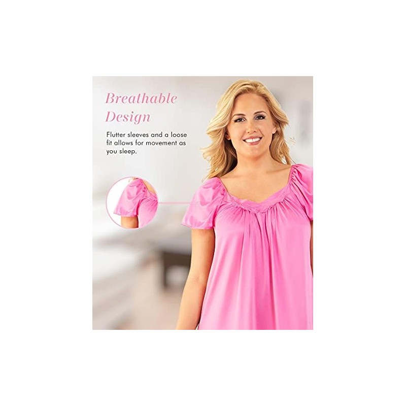 - Silky and breathable nylon tricot knit fabric that is easy-care|Knee length gown with flutter sleeves for maximal comfort and ease of movement|Delicate floral embroidery applique at neckline with gathered pleats at bust for a feminine appeal and comfortable fit