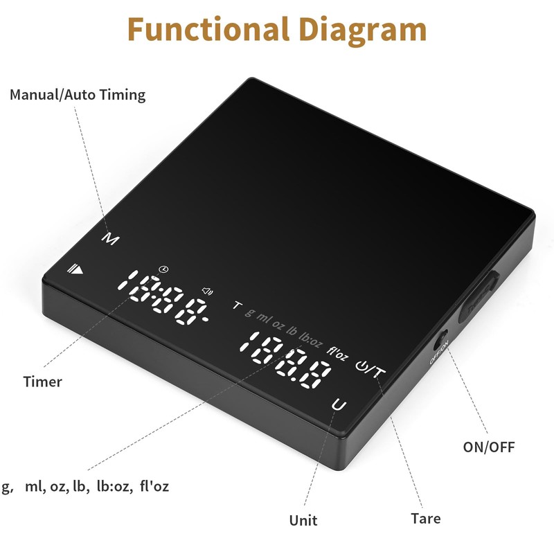 - High precision electronic kitchen scale: this digital coffee scale with automatic weighing function measures from 0.3 g to 2 kg with an accuracy of 1 g. The professional coffee scale supports precise tare function and offers units in g, ml, oz.