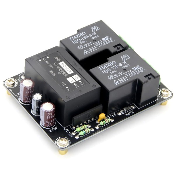 Main Parameters: PCB's board is 2.0MM FR4 board The copper foil of PCB is 2 ounces PCB size: 78.5MM*62MM Working voltage: AC110-220V Relay protection current 30A, suitable for high-power amplifier boards Product weight: 0.1kg Product height: 35mm High-power amplifier speaker protection board Function: Direct AC 110-220V power supply, no need to add another power transformer Time delay protection Amplifier midpoint potential protection