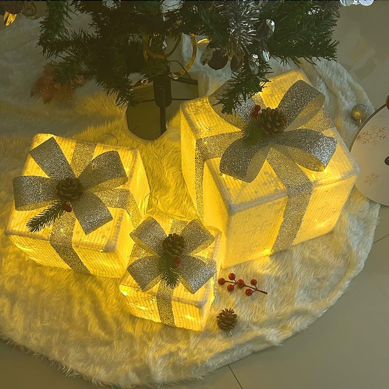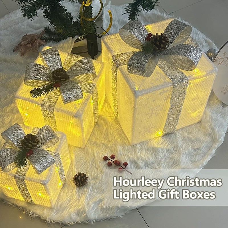 - All Handmade DIY Christmas Decoration:Each light up gift box is completely handmade. Shiny metal wires and glowing LED beads are wrapped around the surface of the gift box. christmas lighted gift boxes contains 3 different sizes, all with pine cones and different coloured bows! These lighted Christmas boxes are beautiful during the day and enchanting at night, I'm sure it will get compliments from your neighbors.