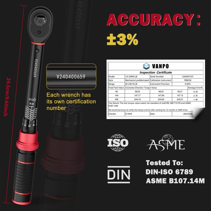 - 【Precision Dual Range Scale】Our torque wrench features dual scales, ranging 20-240 in. lb/2.3-27.1 Nm, ensuring flexibility for users. The calibration error is with approximately ±3%, and each wrench comes with a calibration certificate to guarantee accuracy and reliability.