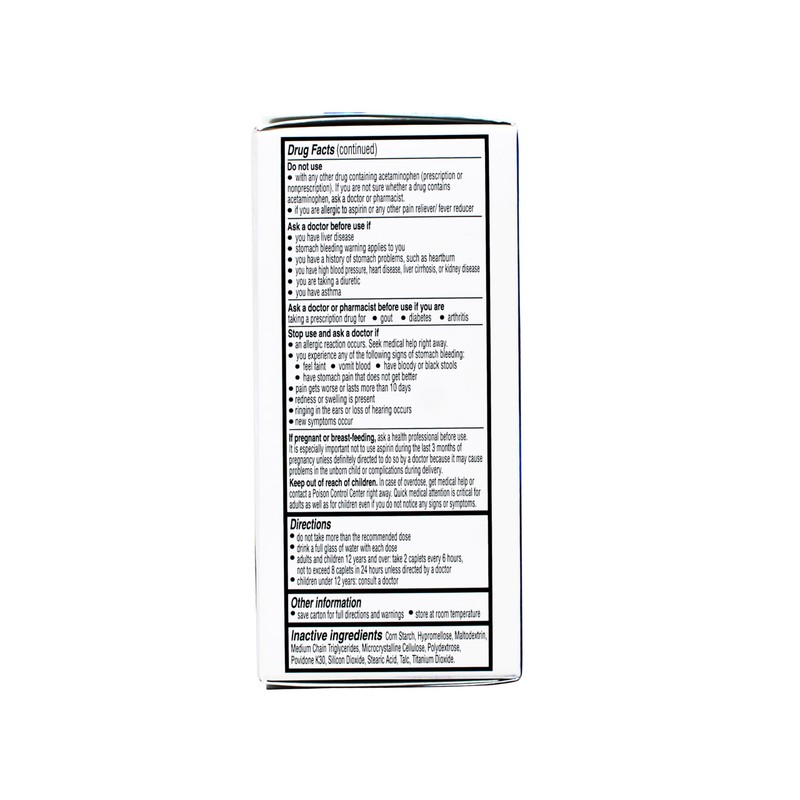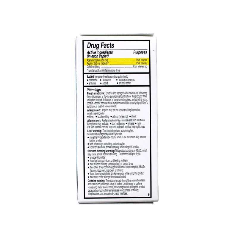 - Each caplet contains:ßacetaminophen 194mg (pain reliever), aspirin 227mg (pain reliever), caffeine 33mg