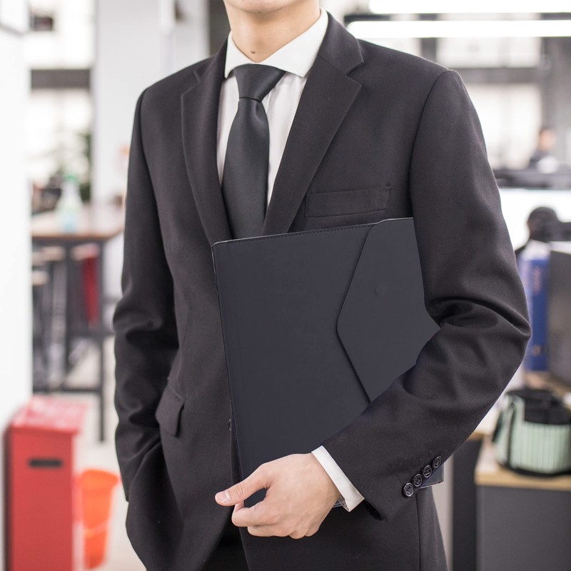 - "Asymmetric Beveled Design": The document pocket with slanted opening has two invisible magnetic buckles that not only protect documents from loss, but also have a great sense of design. There is a PVC label bag inside the folder to hold business cards and ID cards