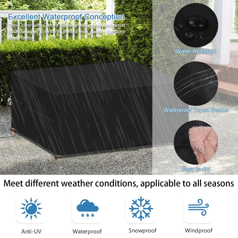 - 420D Oxford fabric waterproof material: cover garden furniture is Oxford polyester with PU thick coating, which is waterproof, weatherproof, dustproof, UV-resistant and tear-resistant. PU is better high-performance than PVC, as it is durable, heat-resistant and tear-resistant, softer and more comfortable