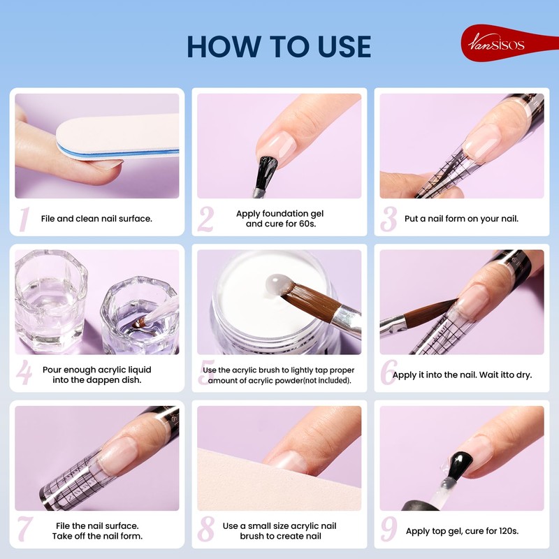 - High-quality Effect:VANSISOS has incorporated a unique moisturizing agent into our formula, which helps maintain flexibility and prevents premature drying. Additionally, our detailed user guide includes tips on how to achieve the perfect balance between wet and dry, ensuring your acrylic nails remain soft, supple, and comfortable to wear.