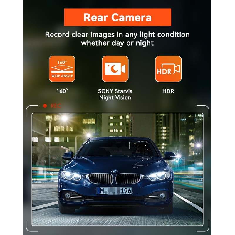- 【1080P Rear Camera &165°Wide Angle】 The rear camera features a high-definition image of 1920x1080P@30FPS, capturing a four-lane view at a 165° angle, as well as detecting motion occurring behind the vehicle. It ensures a wide field of view and a clear, detailed picture for safe driving during the day and night thanks to the sony starvis sensor.