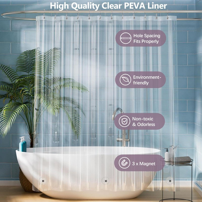 - 100% WATERPROOF & ECO-FRIENDLY LINER - High-quality PEVA material, PVC- and chlorine-free, soft and odorless. The ultra-smooth surface helps water beads form and roll off quickly, keeping your bathroom dry and clean. Magnetic weights at the bottom ensure a secure fit to your bathtub. Unlike other products on the market where the curtain and liner twist and bunch together, we’ve carefully adjusted the hole spacing to ensure a natural, seamless fit, enhancing the overall aesthetic appeal