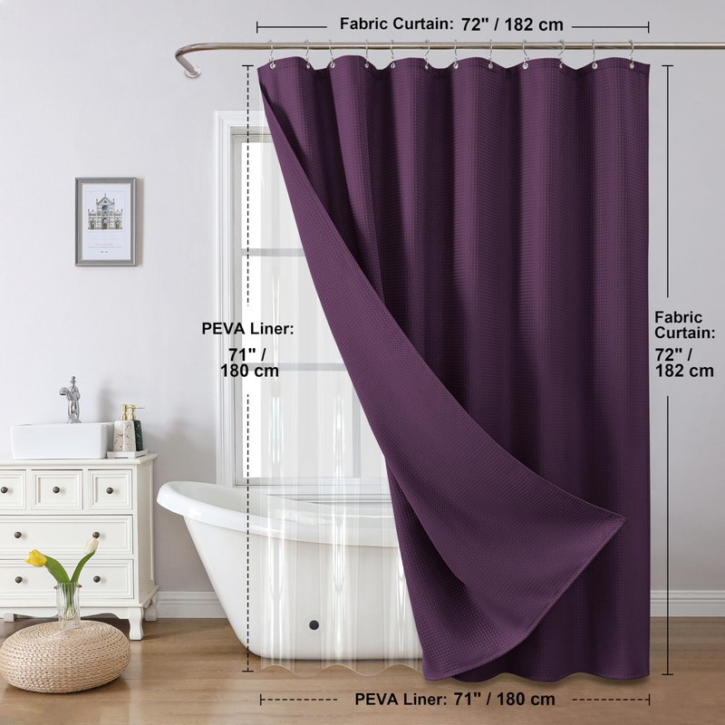 - UNIQUE 3-IN-1 SHOWER CURTAIN SET - The ultimate time and money saver! This thoughtfully crafted set includes a classic waffle-patterned shower curtain, a waterproof liner, and 12 durable stainless steel hooks—everything you need in one convenient package. You can enjoy a worry-free shower with no more splashes or mess. Say goodbye to those complicated installation and replacement processes. One smart investment solves all problems