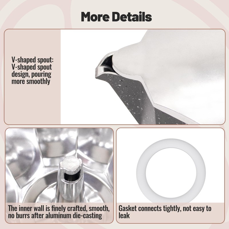 - Exquisite Taste Experience: Elevate your coffee moments with our Moka pot. It's not just about the incredible taste of your cup of coffee; it's about the whole experience. Unleash your creativity and prepare personalized, smooth, and rich brews for your loved ones, evoking elegance and style, regardless of the occasion or setting