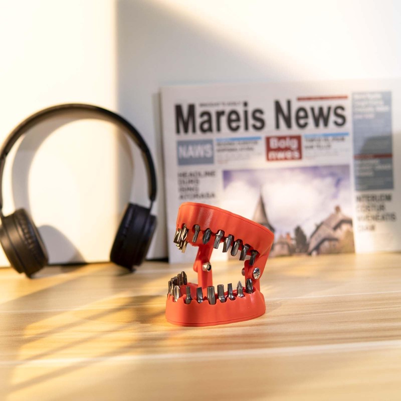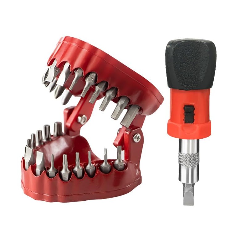 - Hilarious&Functional Denture Drill Bit Holder: Equipped with 1/4’’ hex bits, a screwdriver and mouth bits holder, Varesee denture drill bit holder is a practical tool but also a cool desk gadget. The 28PCS bits include Philips and flat bits. The gums with magnetic strips inside so the bits stay in place.