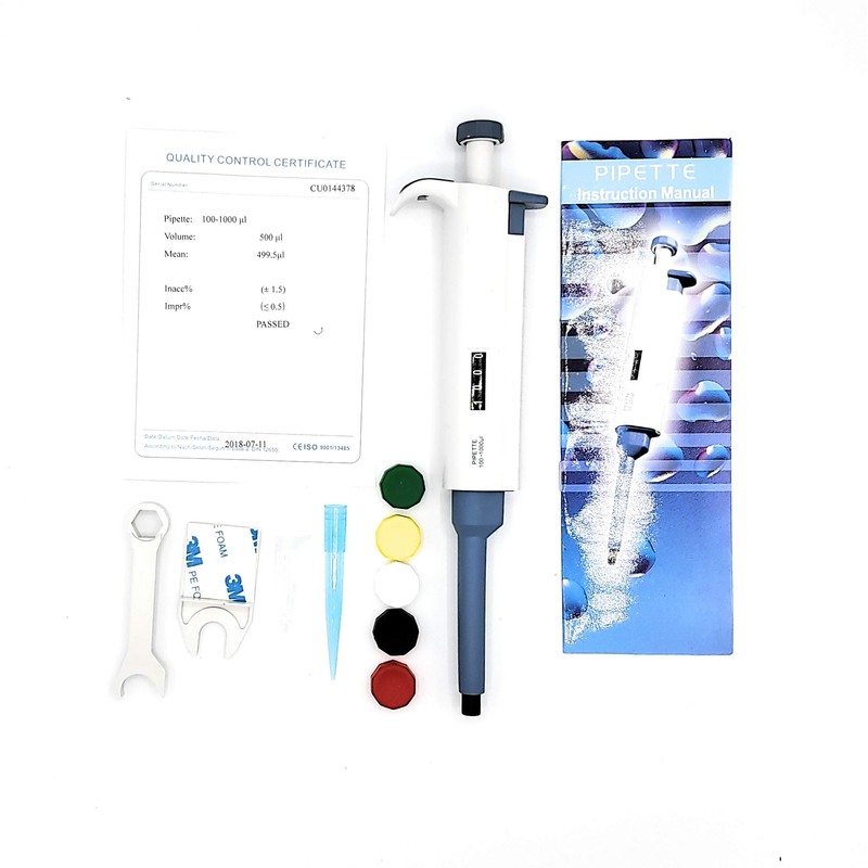 4. One big of accessories including calibration oil, pipette holder, one tip, colored caps, and a removal tool.