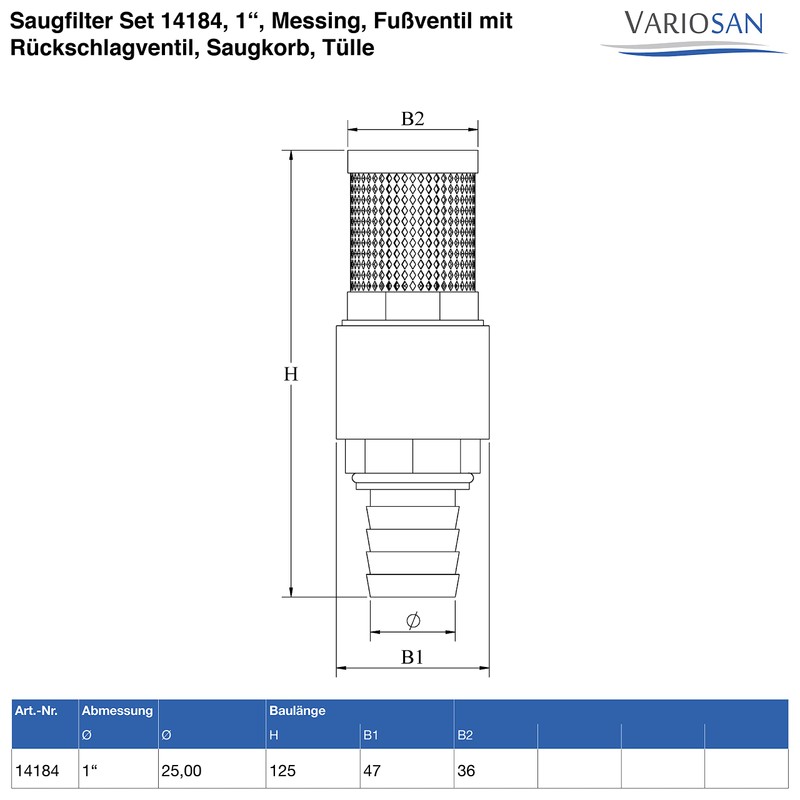 - Solid suction filter set consisting of a foot valve with check valve, a firmly glued suction basket with stainless steel basket, a nozzle with O-ring and a stainless steel hose clamp (W5) for mounting on a hose or suction hose