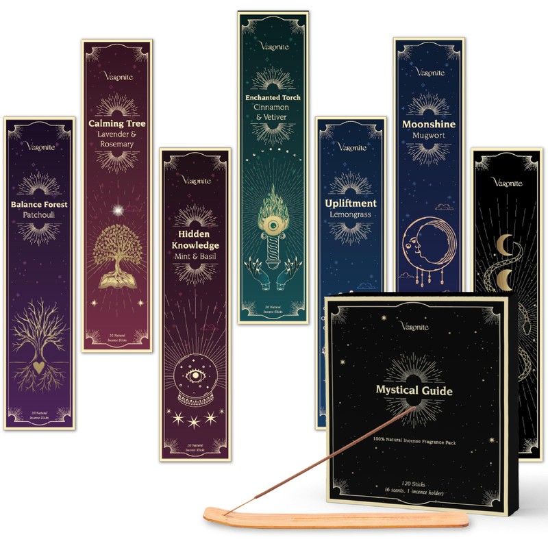 Varonite Incense Sticks - Set of 6 Scents (120 Sticks) + Incense Holder: Patchouli, Lavender Rosemary, Mint Basil, Cinnamon Vetiver, Lemongrass, Mugwort for Witchcraft, Meditation and Aromatherapy