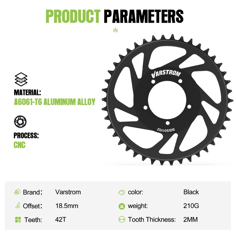 - Universal Compatible:The Varstrom 36T/42T chainring is specifically designed to integrate with BAFANG's mid-drive systems: BBS02B and BBS01B models, which cater to diverse power needs ranging from 250W up to 750W capacities (BBSHD 1000W can't be compatibel).This exclusive compatibility ensures optimal performance and a tailored cycling experience for enthusiasts equipped with these robust motor kits