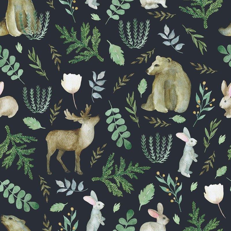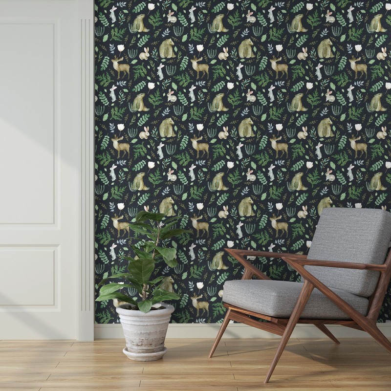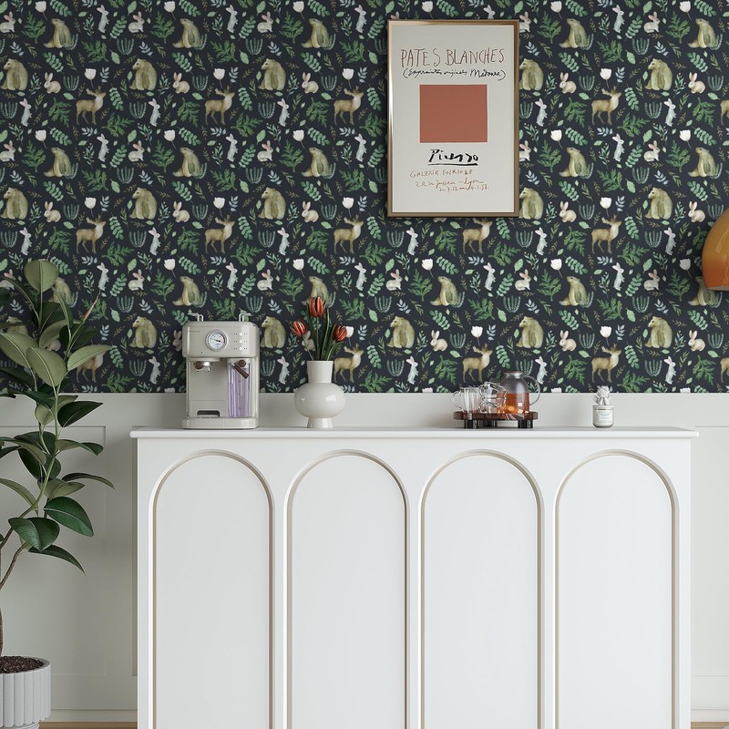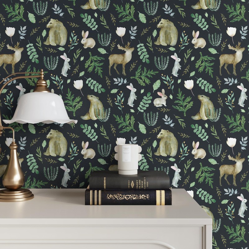- Animal Peel and Stick Wallpaper 🌿 Size&Pattern: 17.7 inches wide by 78.7 inches long, covers 9.68 square feet each roll. Peel and stick wallpaper designed with cute animals deer, rabbits, bears and tropical moss leaves on a black background. Made of high-quality vinyl, matte finish, slightly textured surface, clear printing without any bleeding, non-fading for a long time