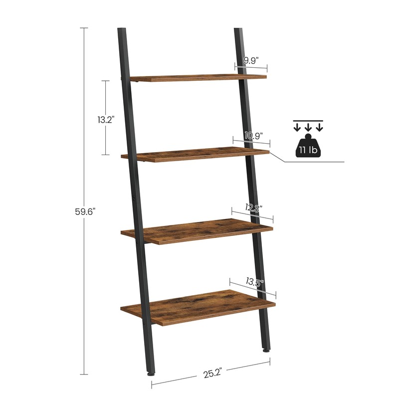 For VASAGLE's industrial series, our designers have taken typical factory items as a model and converted them into practical furniture. A ladder, for example, served as a model for this shelf. In order to be on a par with industrial furniture in terms of functionality and stability, the shelving unit was equipped with an extra sturdy iron frame (20 x 40 cm perimeter). This supports the four durable particleboards and a total load capacity of 88. 2 lb. (40 kg). Slanted but straight While the ladder shelf leans against the wall at an angle, the narrowing shelf surfaces are flat and without an angle of inclination. Place flowers and books on them or use the ladder shelf in the kitchen to store food. In your office or study, the space-saving bookcase in rustic brown helps you to store your books. Looking for a unique ladder shelf design? Which room is still in need of some storage space? Post a photo in the comments and show us your ideas. Specifications: - Color: Rustic Brown - Material: Iron, Particleboard - Size: 25. 2” L x 13. 8” W x 59. 1” H (64 x 35 x 150 cm) - Distance Between The Each Layers: 13” (33. 1 cm) - Weight: 24. 3 lb. (11 kg) - Maximum Total Load Capacity: 88. 2 lb. (40 kg) Package Contents: - 1 x Ladder Shelf - 1 x Accessory Bag - 1 x Instructions