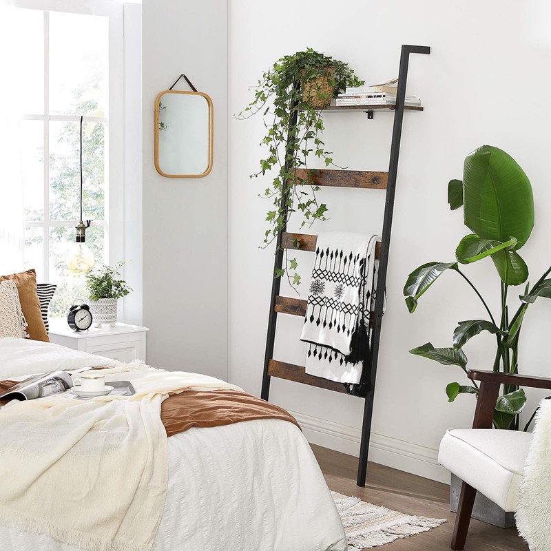 - [What You Get] A blanket ladder with 4 hanging bars, a top shelf, protective feet, easy assembly, and a rustic look that will spruce up your space—all from the ALINRU Collection by VASAGLE