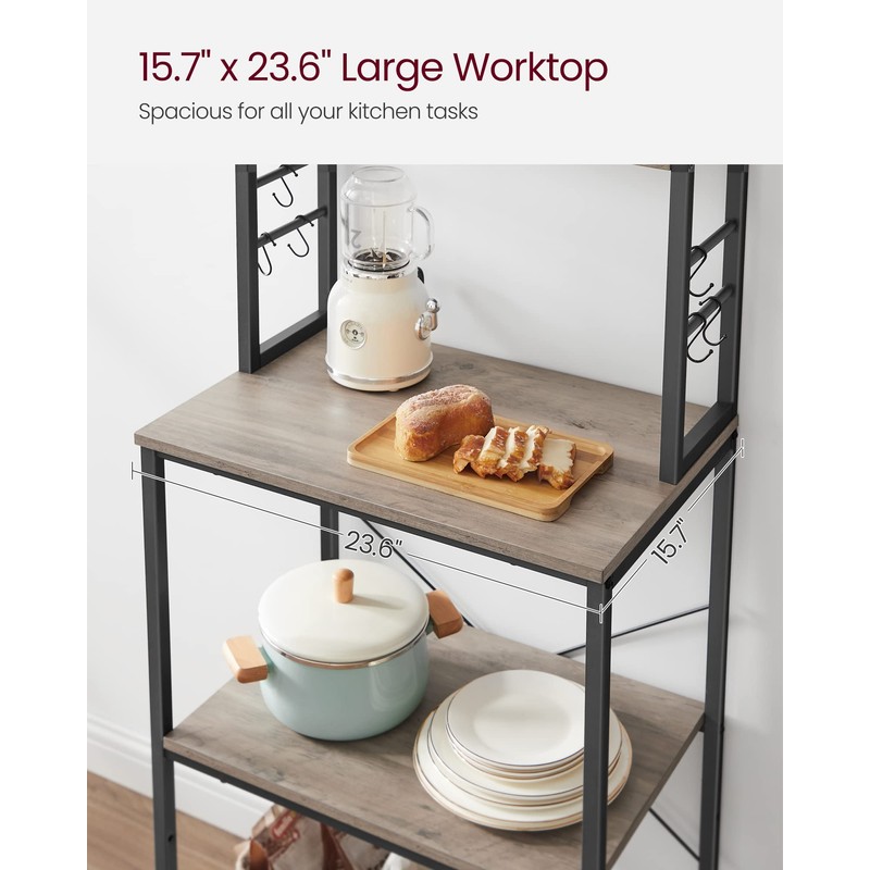 - [Storage for All] Free up your counter space with this baker’s rack that boasts tons of storage—3 upper shelves for bottles, 3 large lower shelves for kitchen appliances, and 6 S-hooks for cooking tools. This all-in-one rack streamlines your kitchen!