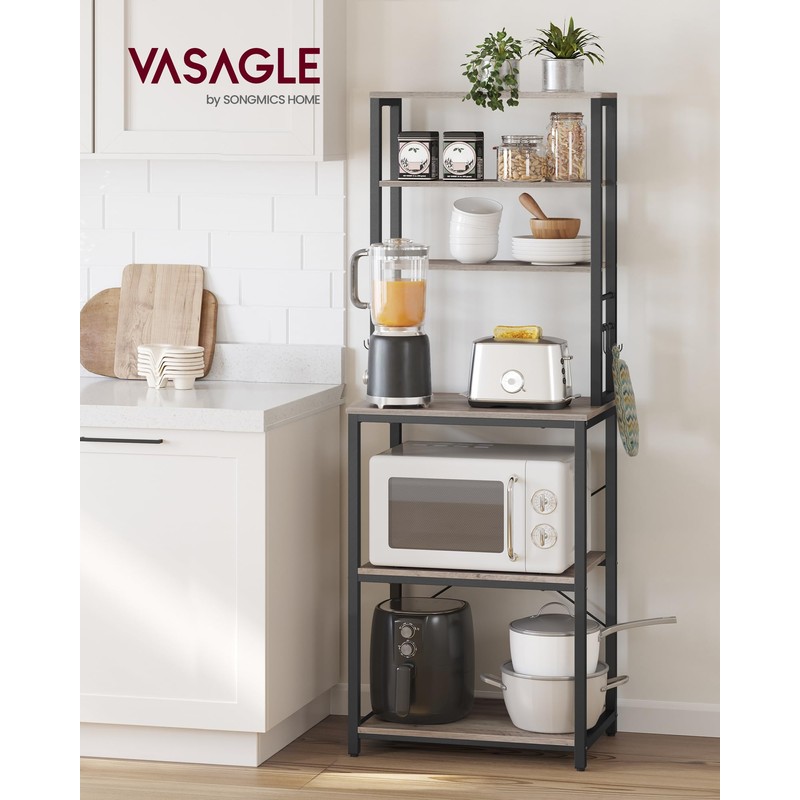 VASAGLE Coffee Bar, Baker’s Rack for Kitchen with Storage, 6-Tier Kitchen Shelves with 6 Hooks, Microwave Stand, Industrial, 15.7 x 23.6 x 65.7 Inches, Greige and Black UKKS024B02